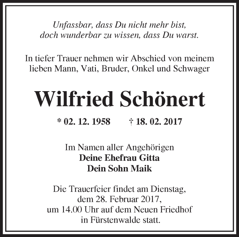 Hier finden Sie alle Traueranzeigen aus der Zeitung, die bisher für Wilfried Schönert erschienen sind. Weitere Traueranzeigen, die in der Zeitung erscheinen, werden hier ebenfalls aufgelistet